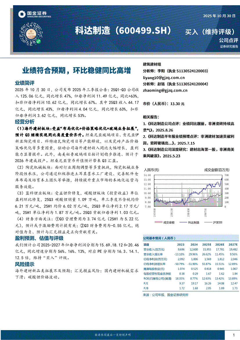 科达制造:国金证券-科达制造-600499-业绩符合预期,环比稳健同比高增-251030