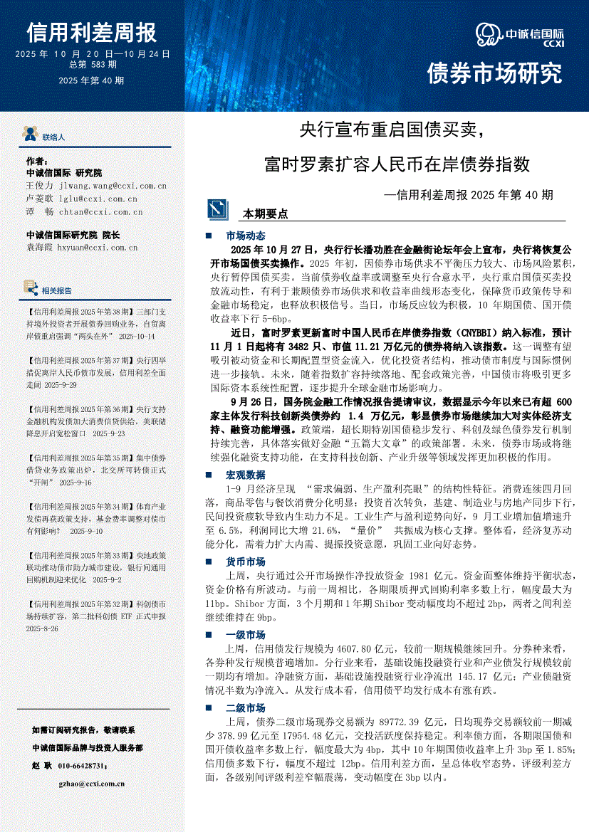 中诚信国际-信用利差周报2025年第40期:央行宣布重启国债买卖,富时罗素扩容人民币在岸债券指数-251024