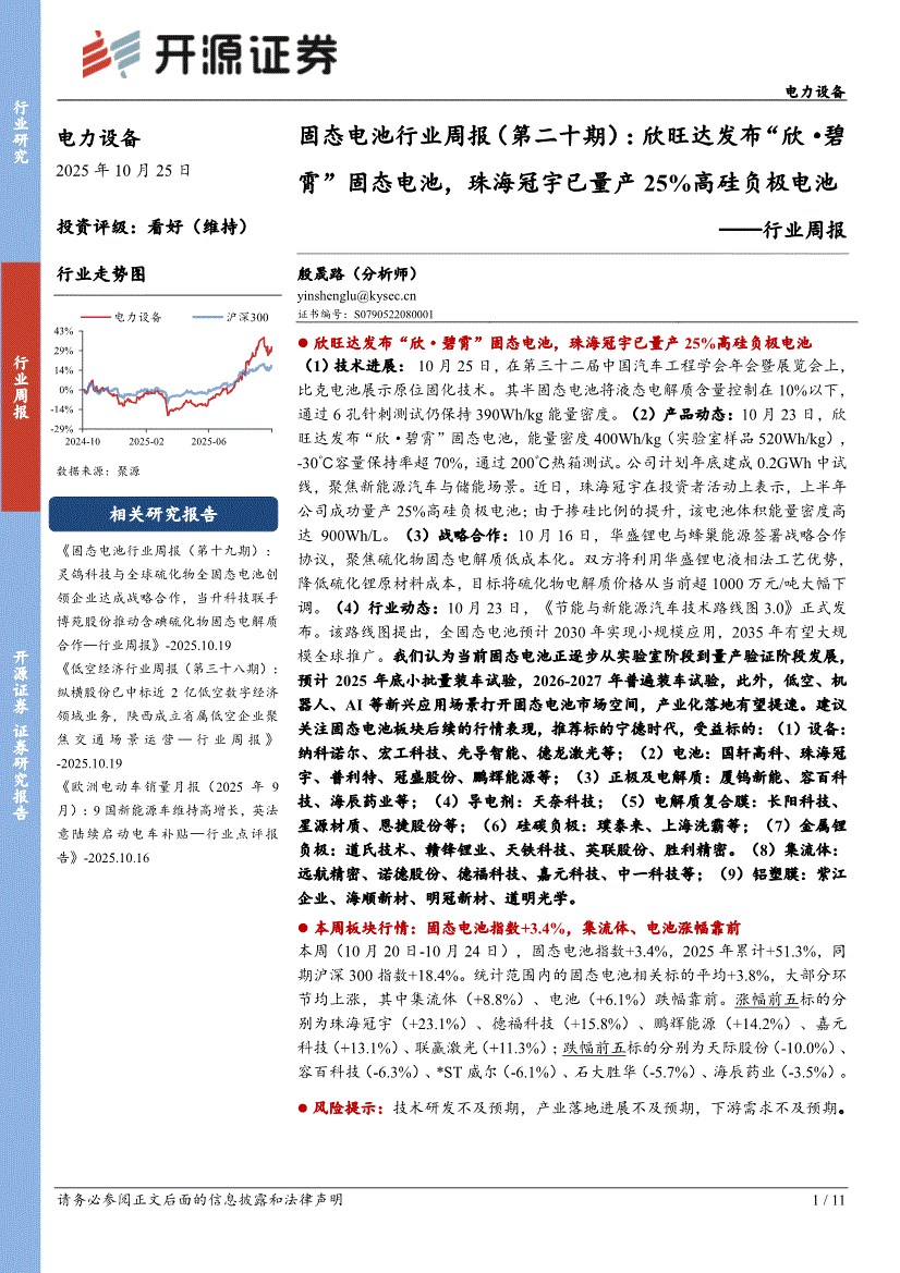 电力设备行业:开源证券-电力设备行业周报:固态电池行业周报(第二十期),欣旺达发布“欣·碧霄”固态电池,珠海冠宇已量产25%高硅负极电池-251025