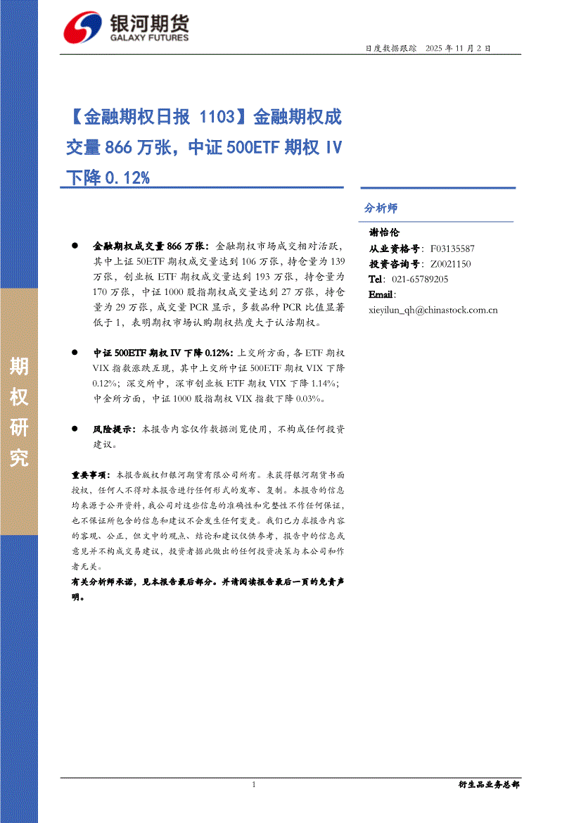 银河期货-【金融期权日报1103】金融期权成交量866万张,中证500ETF期权IV下降0.12%-251102