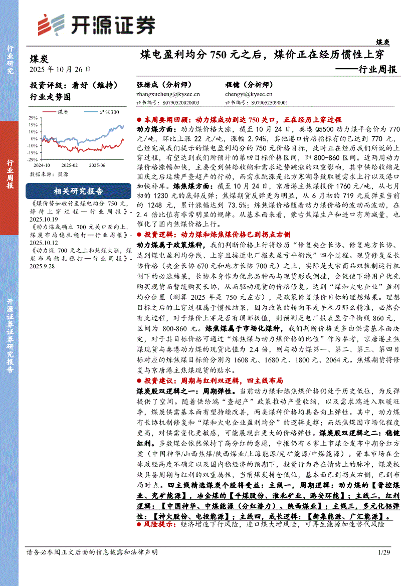 煤炭行业:开源证券-煤炭行业周报:煤电盈利均分750元之后,煤价正在经历惯性上穿-251026