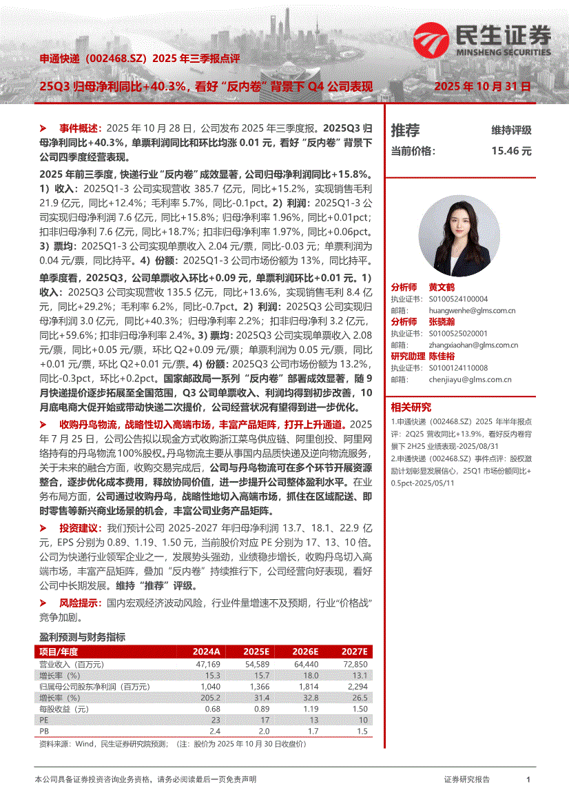 申通快递:民生证券-申通快递-002468-2025年三季报点评:25Q3归母净利同比+40.3%,看好“反内卷”背景下Q4公司表现-251031