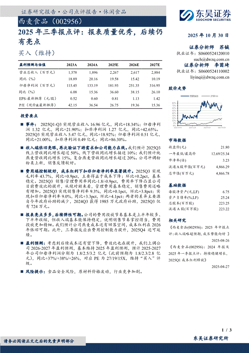 西麦食品:东吴证券-西麦食品-002956-2025年三季报点评:报表质量优秀,后续仍有亮点-251030
