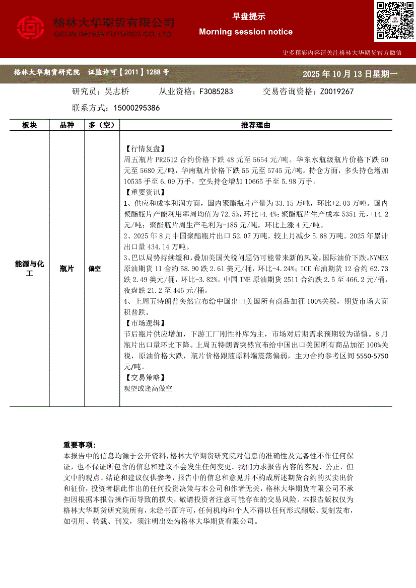 格林大华期货-早盘提示:瓶片-251013