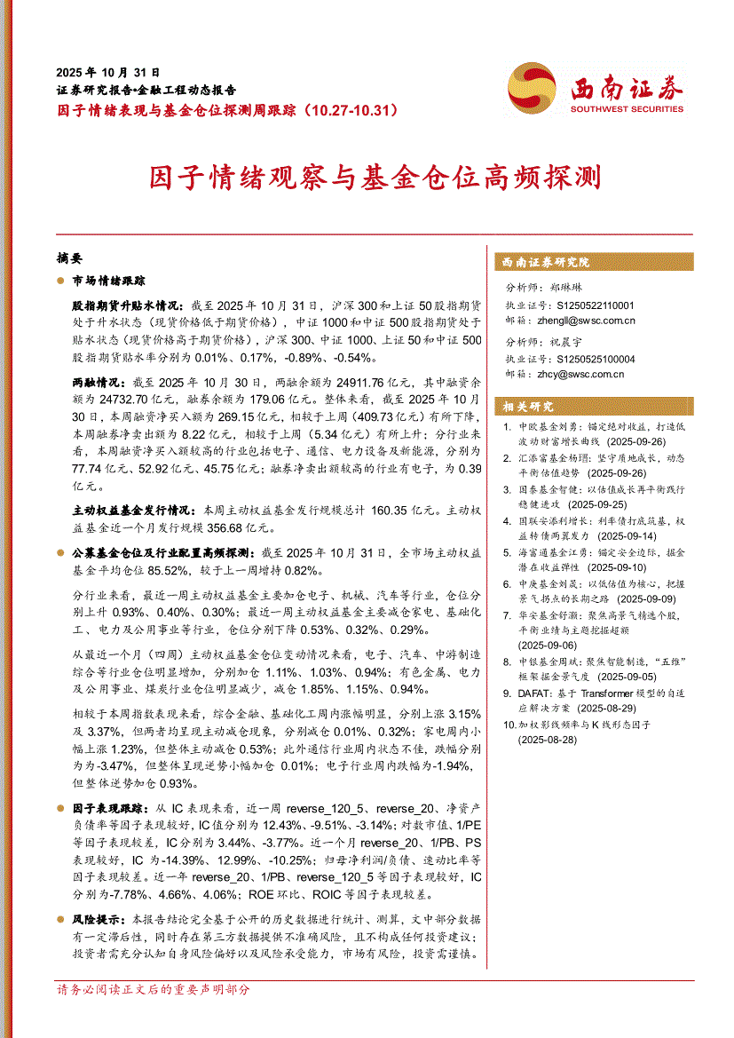 西南证券-因子情绪表现与基金仓位探测周跟踪:因子情绪观察与基金仓位高频探测-251031