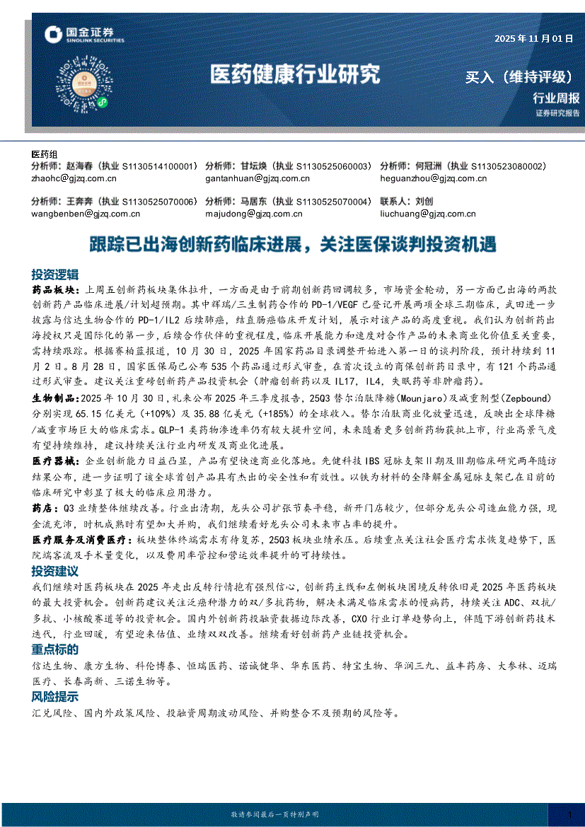 医药健康行业:国金证券-医药健康行业周报:跟踪已出海创新药临床进展,关注医保谈判投资机遇-251101
