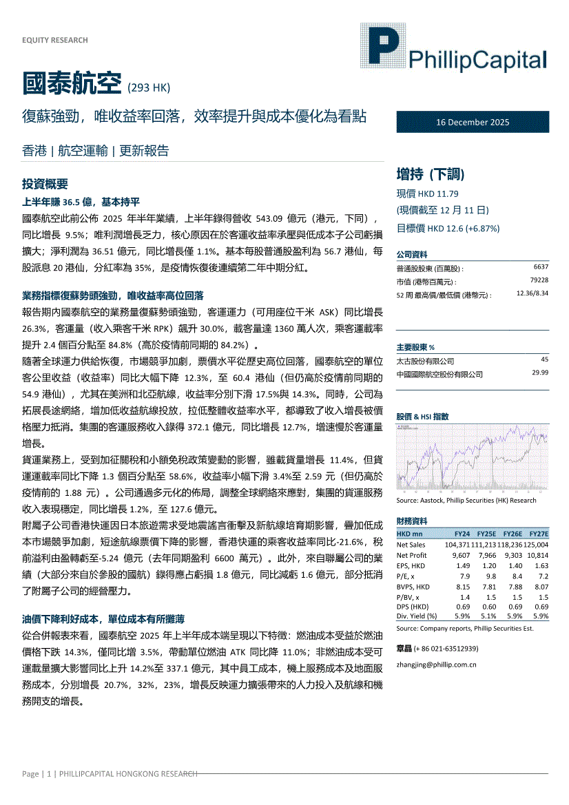 國泰航空:辉立证券-國泰航空-0293.HK-復蘇強勁,唯收益率回落,效率提升與成本優化為看點-251216