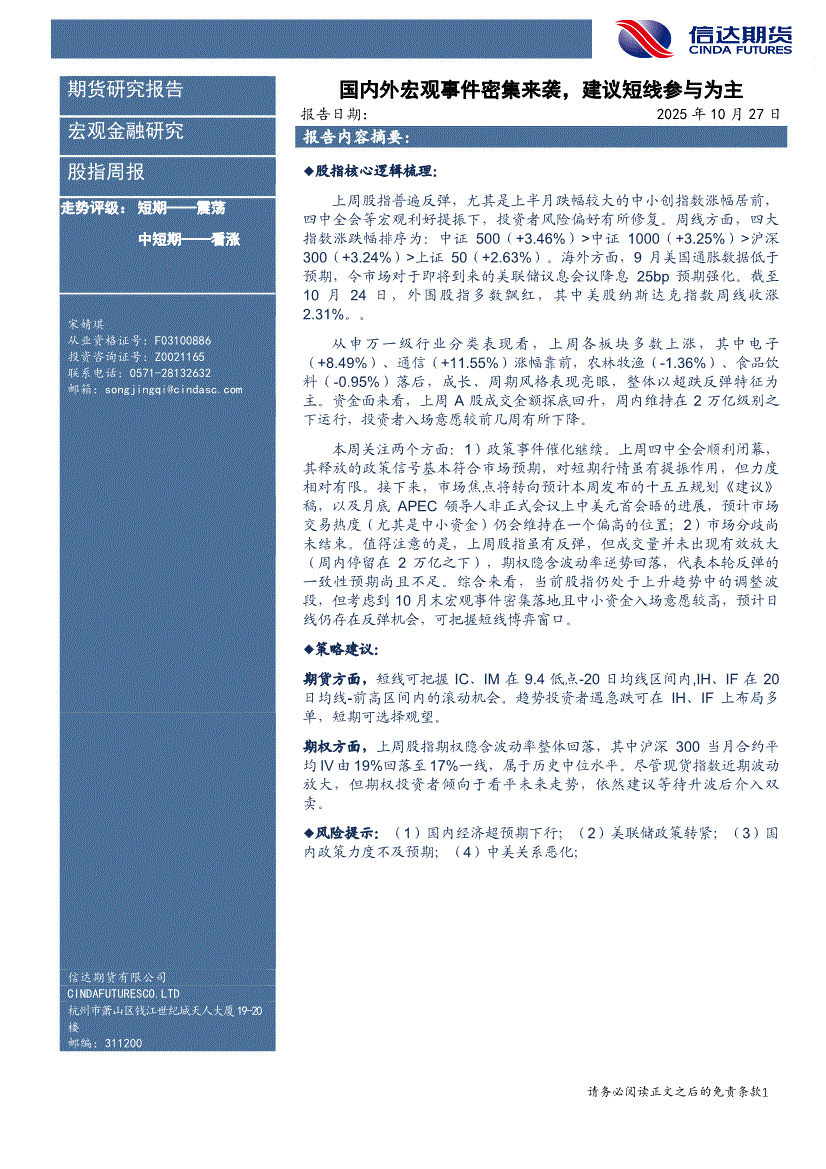 信达期货-股指周报:国内外宏观事件密集来袭,建议短线参与-251027