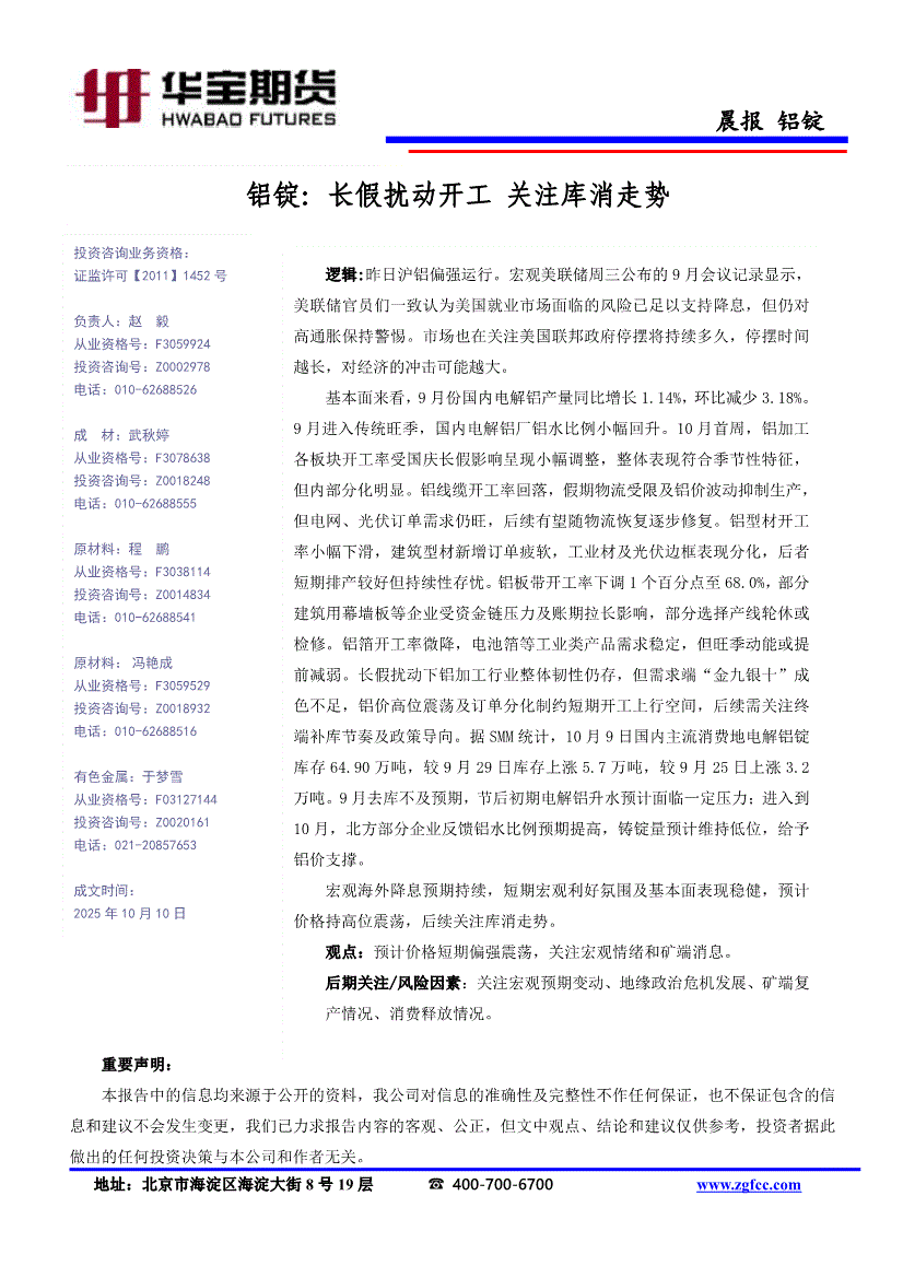 华宝期货-铝锭:长假扰动开工,关注库消走势-251010
