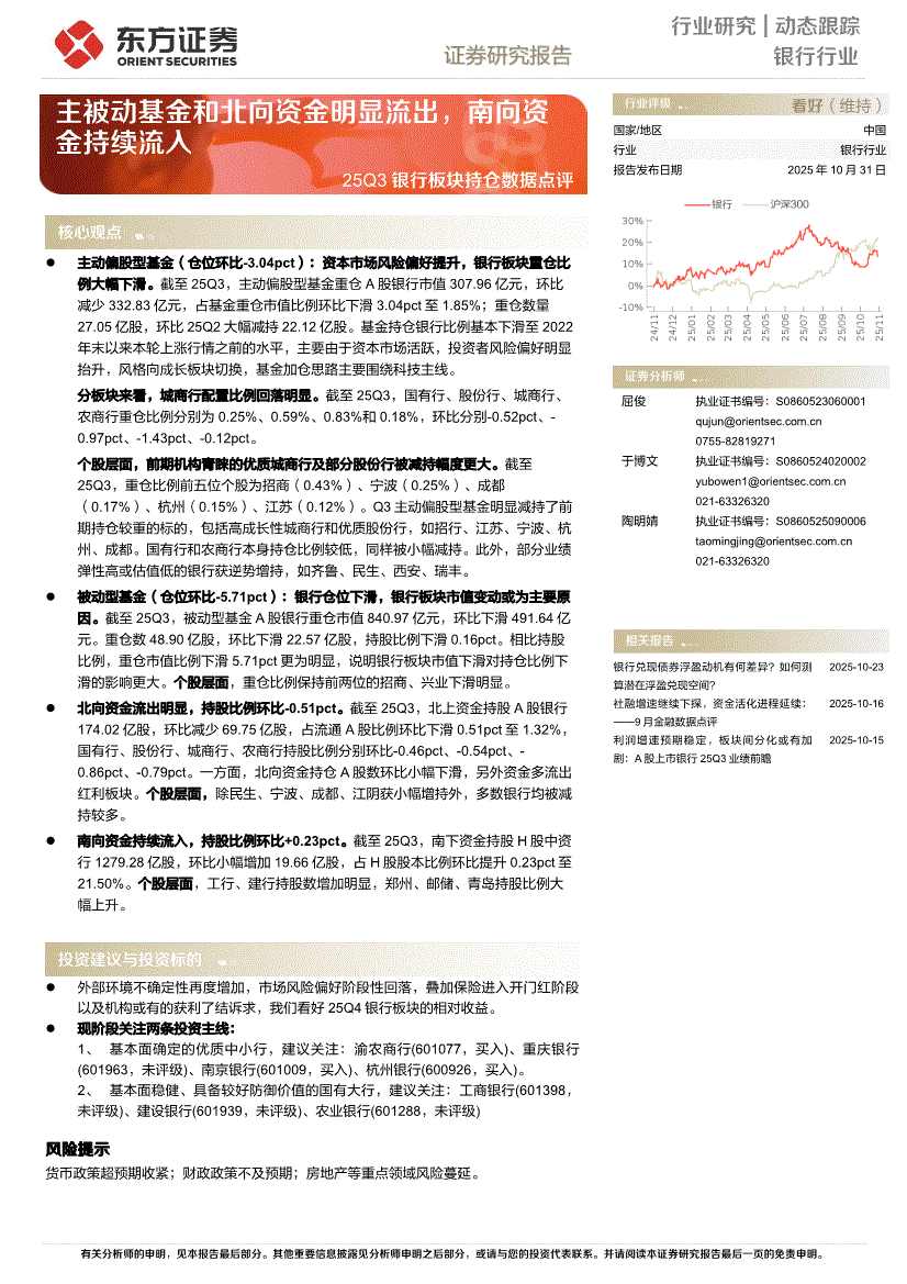 银行业:东方证券-银行行业25Q3银行板块持仓数据点评:主被动基金和北向资金明显流出,南向资金持续流入-251031