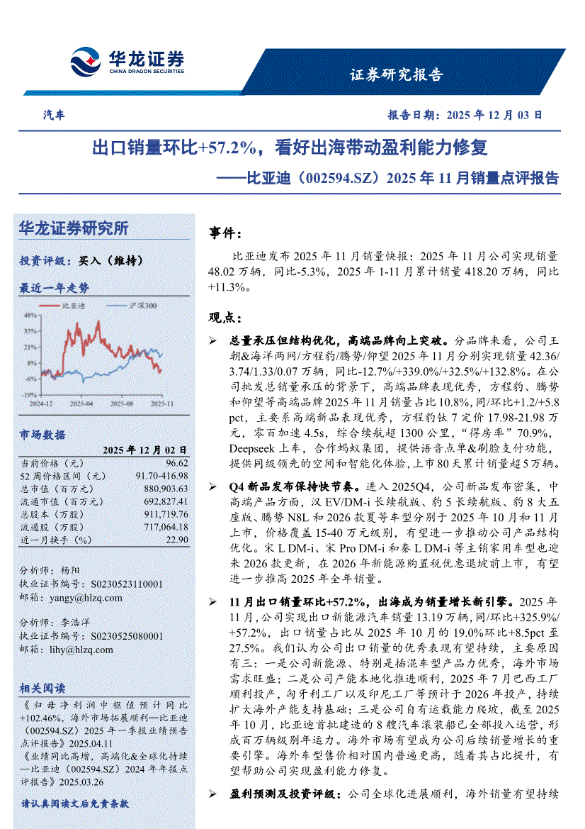 比亚迪:华龙证券-比亚迪-002594-2025年11月销量点评报告:出口销量环比+57.2%,看好出海带动盈利能力修复-251203