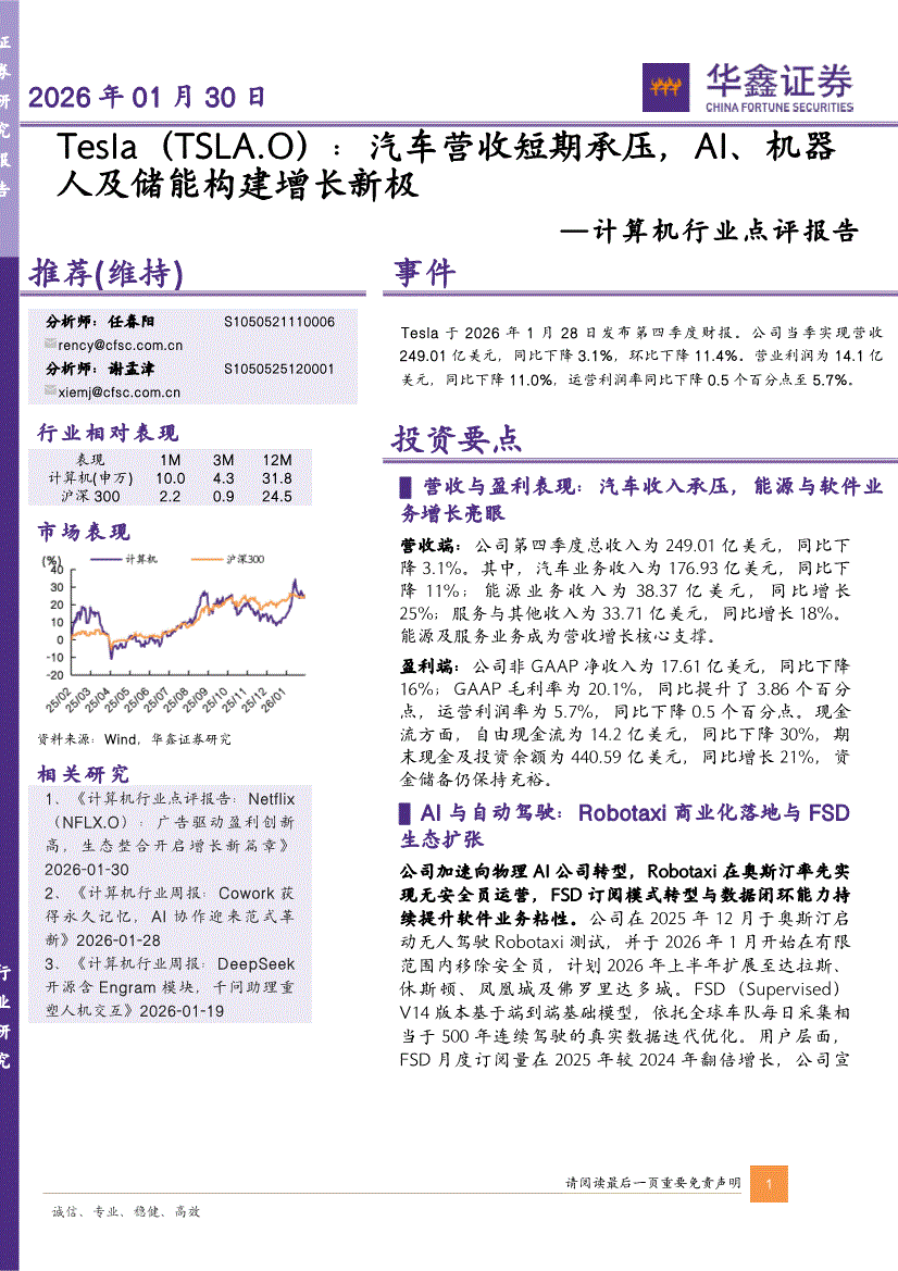 计算机行业:华鑫证券-计算机行业点评报告:Tesla(TSLA.O),汽车营收短期承压,AI、机器人及储能构建增长新极-260130