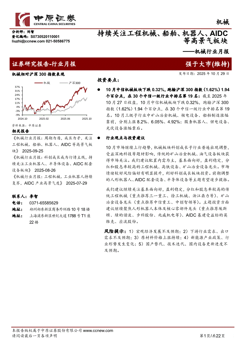 机械行业:中原证券-机械行业月报:持续关注工程机械、船舶、机器人、AIDC等高景气板块-251029