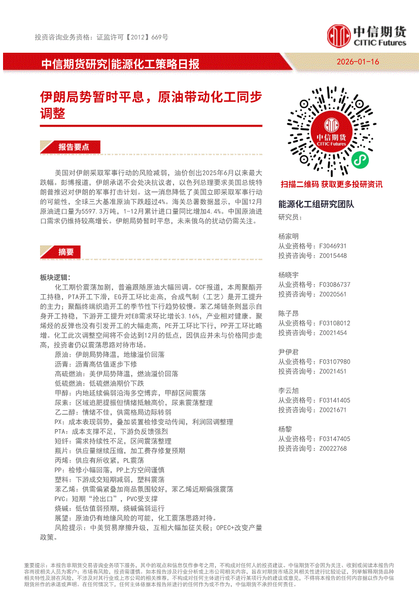 中信期货-能源化工策略日报:伊朗局势暂时平息,原油带动化工同步调整-260116