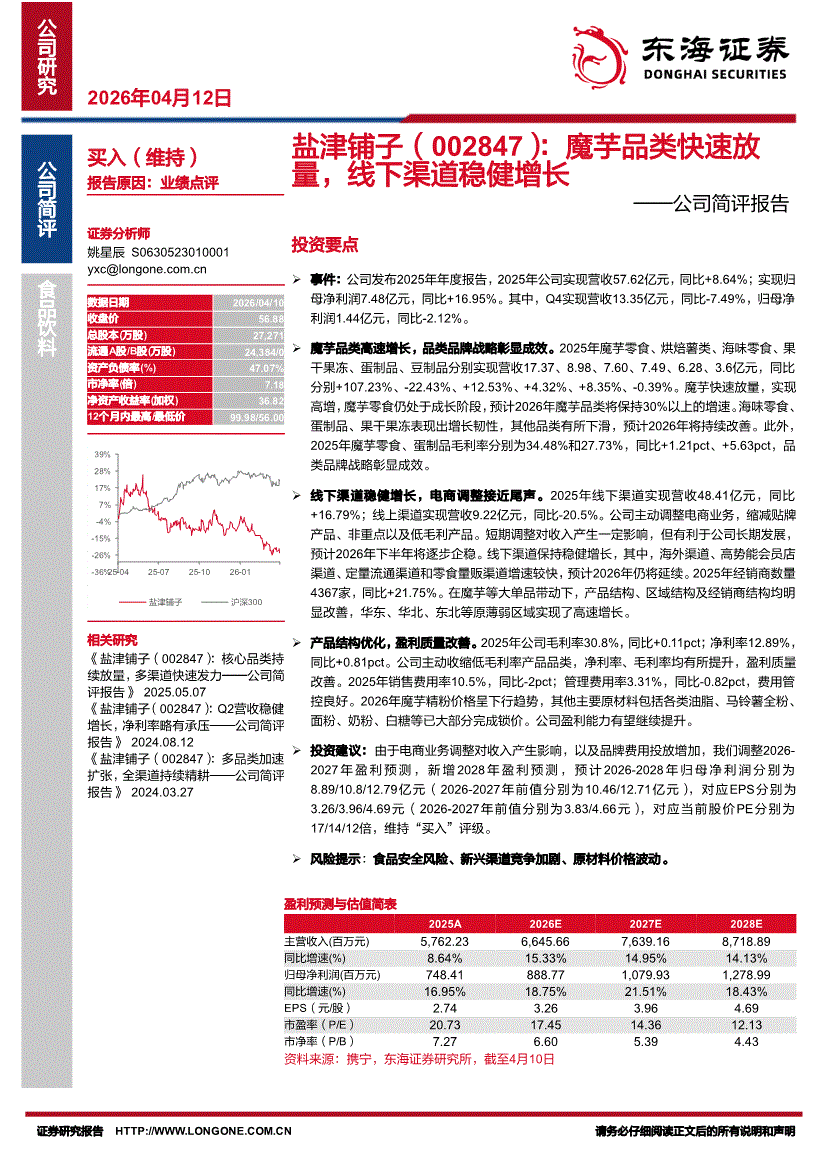 盐津铺子:东海证券-盐津铺子-002847-公司简评报告:魔芋品类快速放量,线下渠道稳健增长-260412