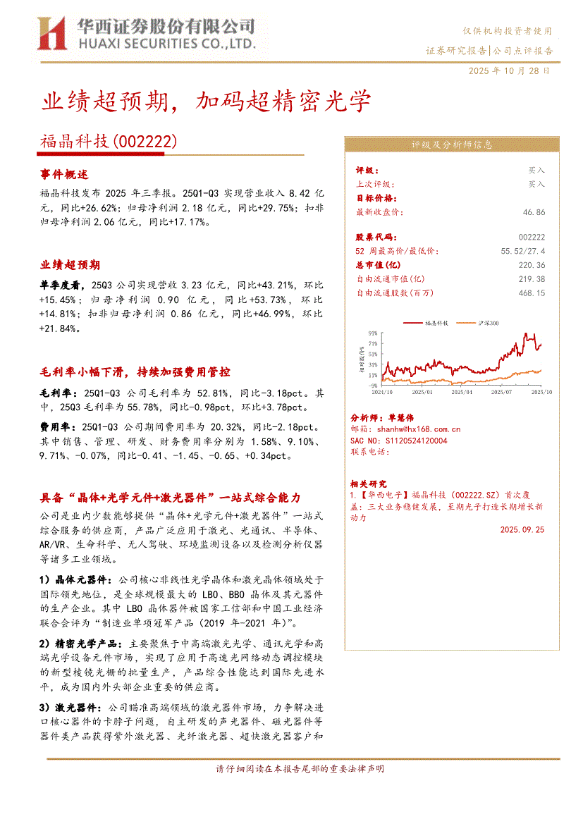 福晶科技:华西证券-福晶科技-002222-业绩超预期,加码超精密光学-251028
