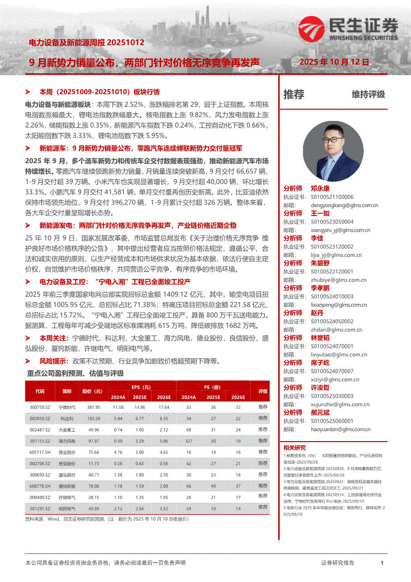 电力设备及新能源行业:民生证券-电力设备及新能源行业周报:9月新势力销量公布,两部门针对价格无序竞争再发声-251012