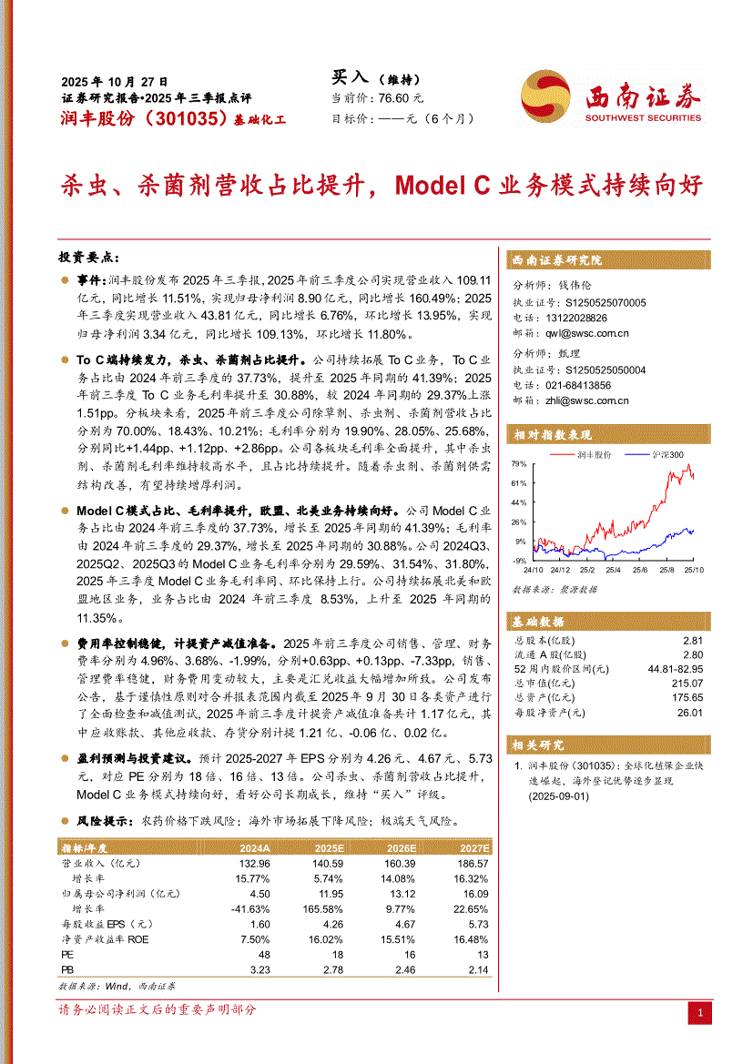 润丰股份:西南证券-润丰股份-301035-杀虫、杀菌剂营收占比提升,Model C业务模式持续向好-251027