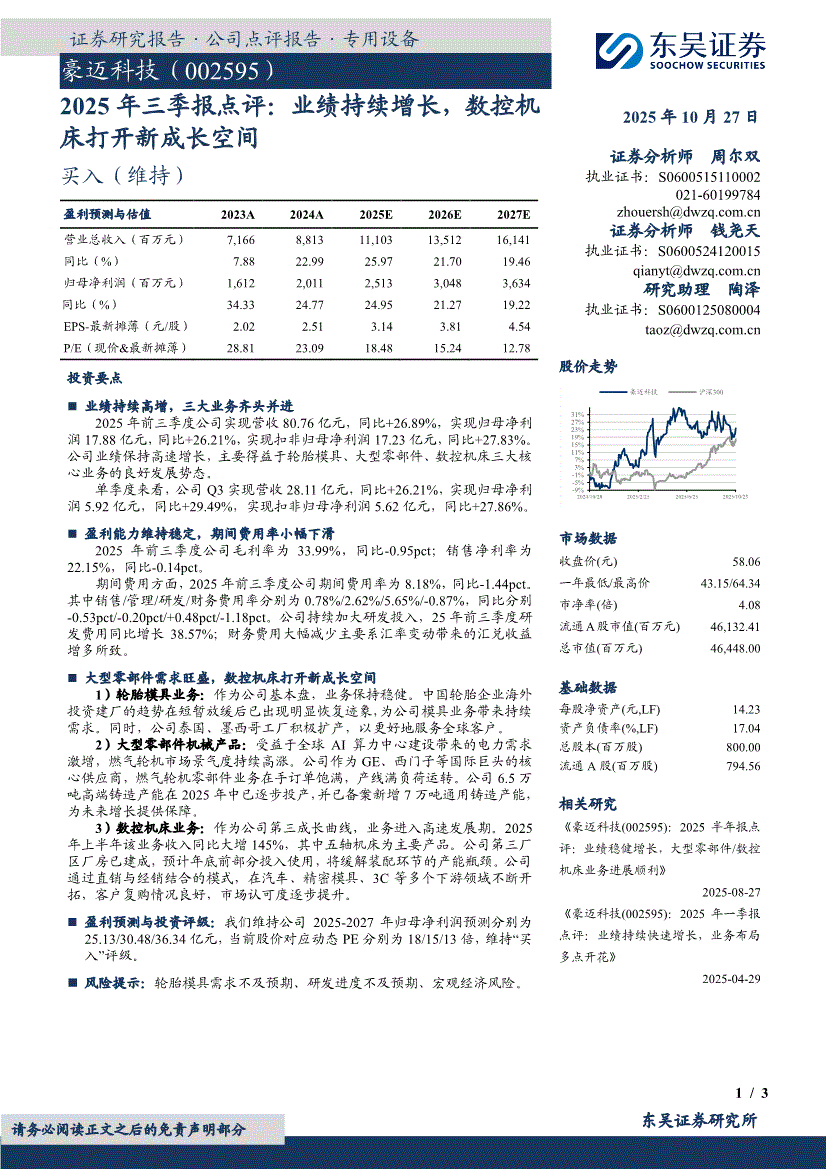 豪迈科技:东吴证券-豪迈科技-002595-2025年三季报点评:业绩持续增长,数控机床打开新成长空间-251027