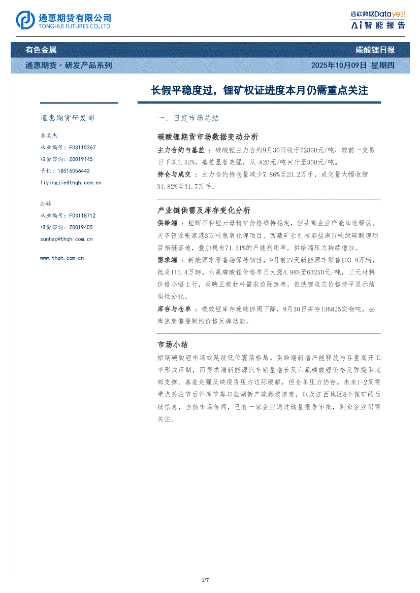 通惠期货-碳酸锂日报:长假平稳度过,锂矿权证进度本月仍需重点关注-251009