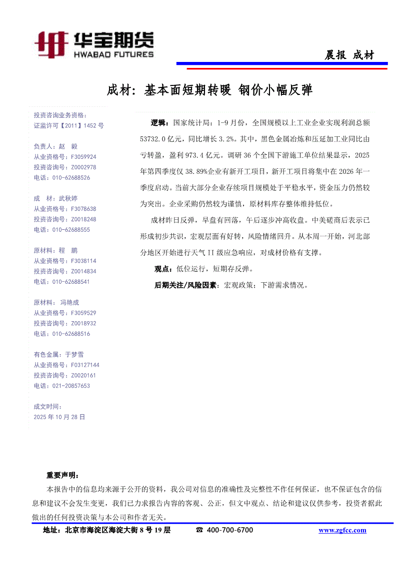 华宝期货-成材:基本面短期转暖,钢价小幅反弹-251028