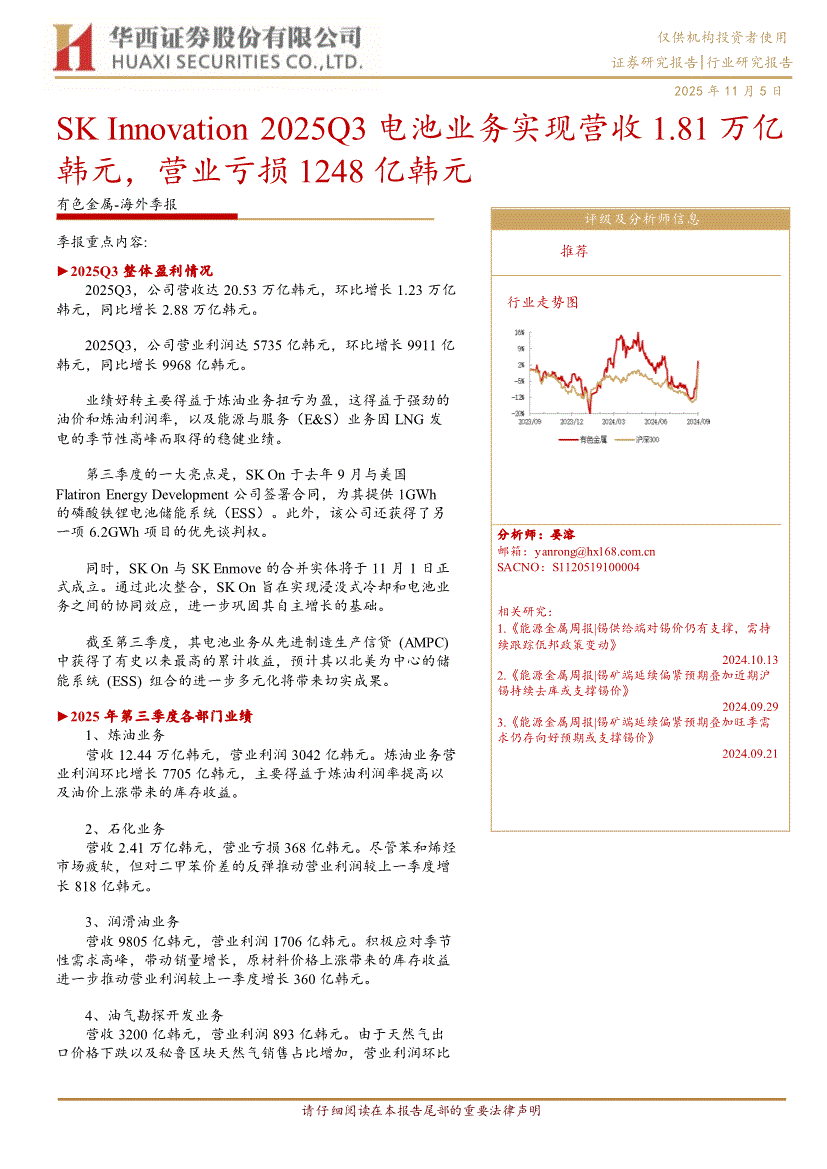 有色金属行业:华西证券-有色金属行业~海外季报:SK Innovation 2025Q3电池业务实现营收1.81万亿韩元,营业亏损1248亿韩元-251105