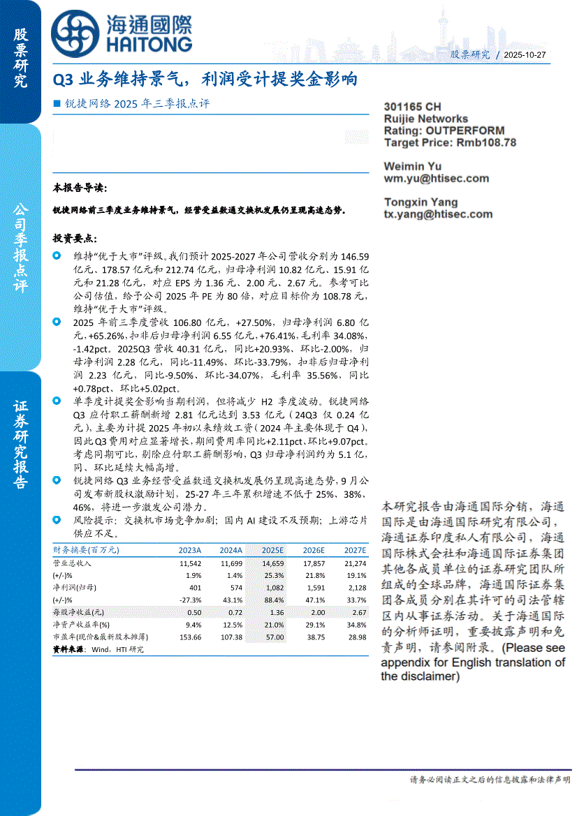 锐捷网络:海通国际-锐捷网络-301165-2025年三季报点评:Q3业务维持景气,利润受计提奖金影响-251027