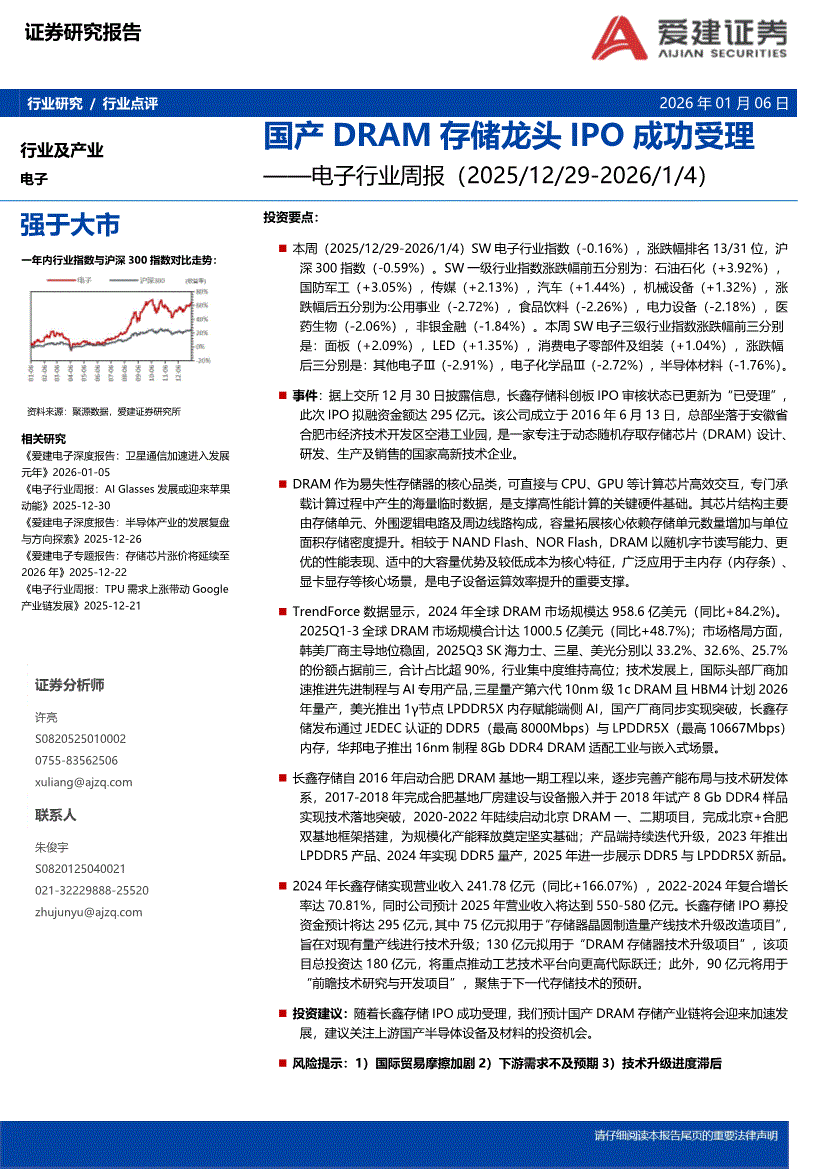 电子行业:爱建证券-电子行业周报:国产DRAM存储龙头IPO成功受理-260106