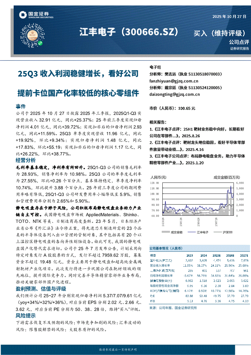 江丰电子:国金证券-江丰电子-300666-25Q3收入利润稳健增长,看好公司卡位国产化率低的核心零组件-251027
